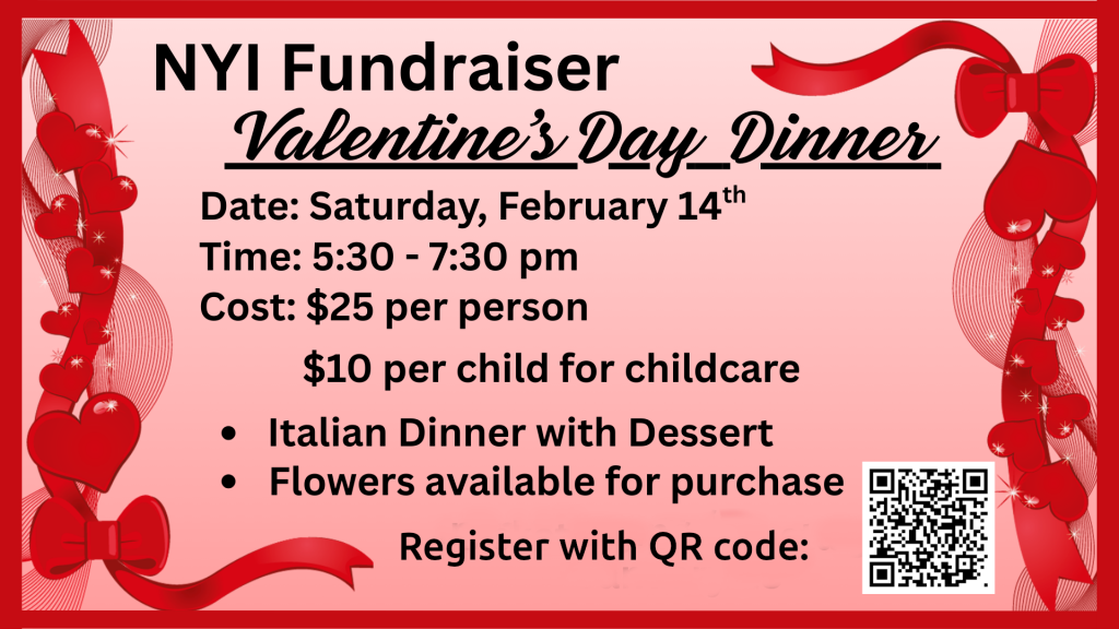 Valentine’s time is a great time to do something special with someone special! There is a registration page where you can specify the number of tickets and whether you will need child care. You can pay for the tickets through the church’s giving portal and designate it as Valentine’s Banquet.
